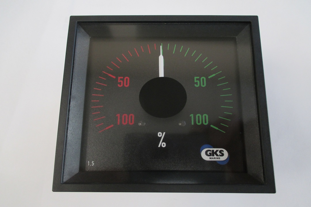 Quadratisch 96 x 96 mm, Nullpunkt bei 12 UhrSkala 100%...0...100%, Links: rot, Rechts: grünDurchlichtskale schwarz, Zeiger weiß,Innenbeleuchtung 24V, LED
