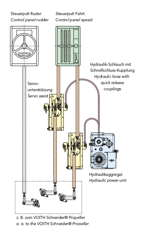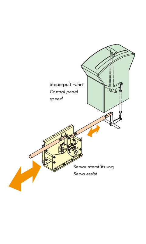 Bei einem Ausfall der Schiffshydraulik kann das mechanische Gestänge wie bisher bewegt werden. Die Bedienkräfte des Schiffs sind dann so hoch wie ohne Servounterstützung.